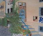 2011Dit is in een straatje in een stadje (Colioure) aan de Middelandse zee Het is net nog Frankrijk. Even verder is het Spanje. In dit stadje zijn veel bekende schilders wezen schilderen, zoals Matisse, Picasso e.v.a. Aan de muur heb ik 2 werken van Matisse opgehangen. In dit straatje is een winkeltje met schilderijen.Boven aan de trap is een deur die geen deur is, maar een groot schilderij dat als een paneel met scharnieren aan de wand hangt. Erachter is een platje met een ingang naar de galerie.